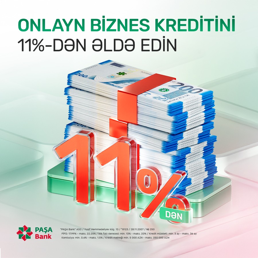 Kredit məhsulu “PAŞA Bank Biznes platforması” və mobil tətbiq vasitəsilə tam rəqəmsal, sürətli və əlavə maliyyə təhlili olmadan təqdim olunur. Ətraflı məlumat üçün təqdim olunan linkə keçid edə bilərsiniz.