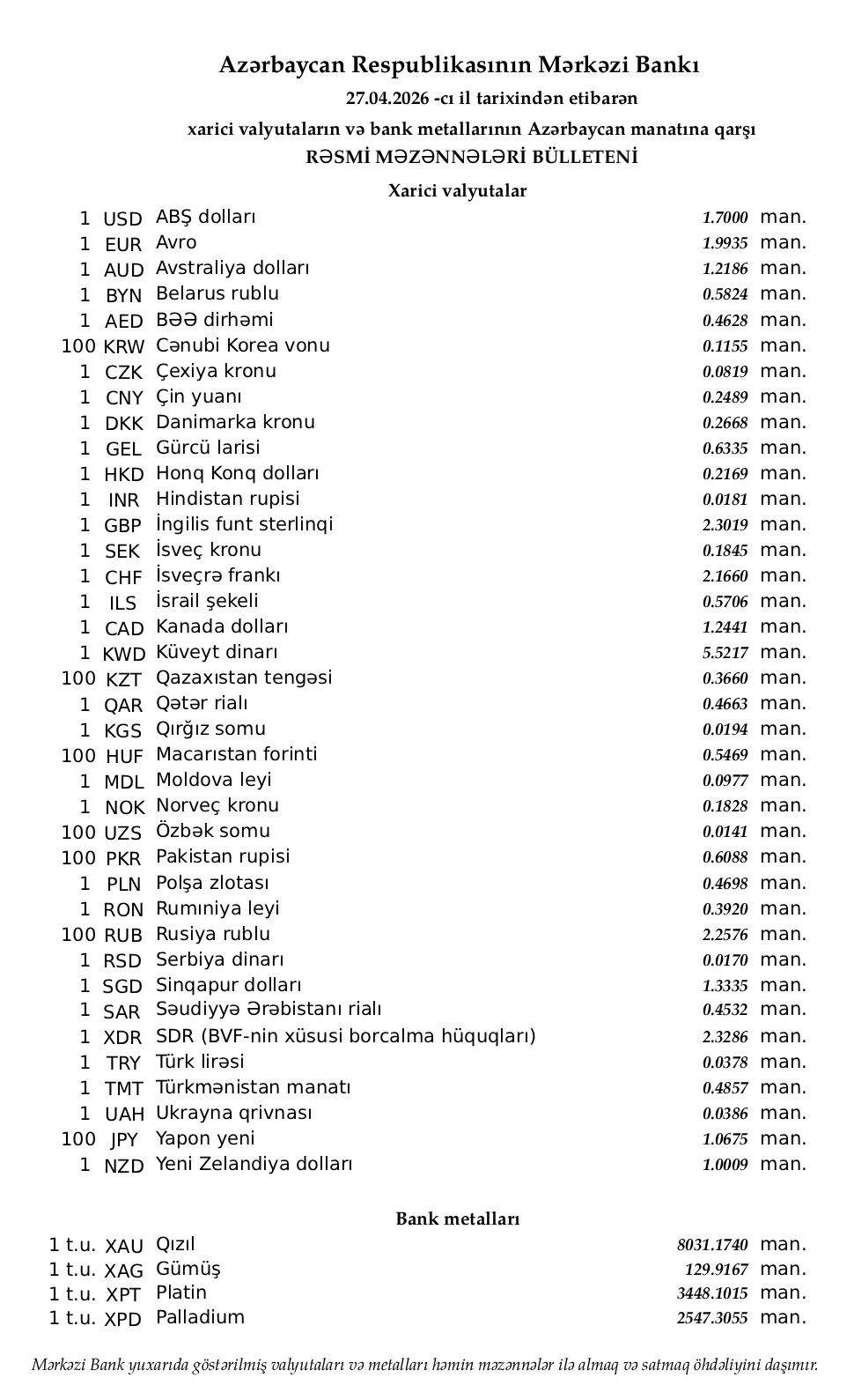 Rəsmi məzənnələr açıqlandı