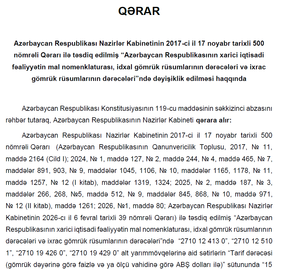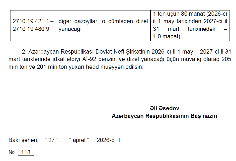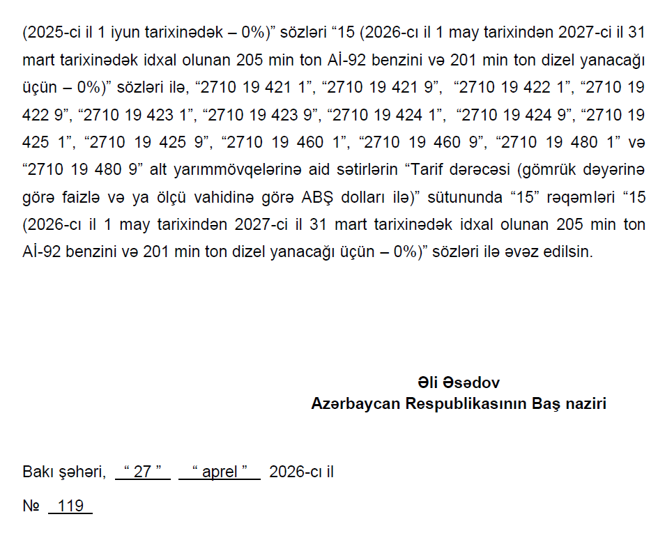 Nazirlər Kabineti “Azərbaycan Respublikasının xarici iqtisadi fəaliyyətin mal nomenklaturası, idxal gömrük rüsumlarının dərəcələri və ixrac gömrük rüsumlarının dərəcələri”ndə də dəyişiklik edib. 2026-cı il 1 may tarixindən 2027-ci il 31 mart tarixinədək idxal olunan 205 min ton Aİ-92 benzini və 201 min ton dizel yanacağı üçün gömrük rüsumu 0% müəyyənləşib.