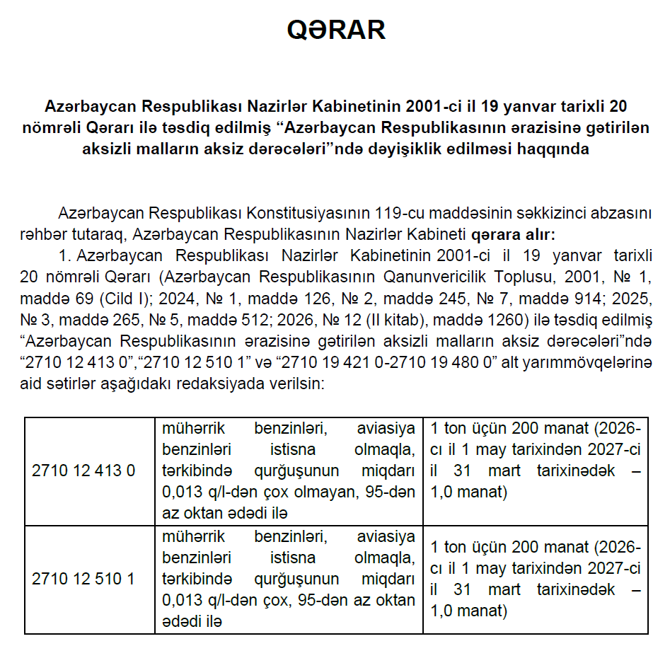 Qərara əsasən, mühərrik benzinləri, aviasiya benzinləri istisna olmaqla, tərkibində qurğuşunun miqdarı 0,013 q/l-dən çox olmayan, 95-dən az oktan ədədi ilə 1 ton üçün 200 manat (2026- cı il 1 may tarixindən 2027-ci il 31 mart tarixinədək – 1,0 manat), mühərrik benzinləri, aviasiya benzinləri istisna olmaqla, tərkibində qurğuşunun miqdarı 0,013 q/l-dən çox, 95-dən az oktan ədədi ilə 1 ton üçün 200 manat (2026- cı il 1 may tarixindən 2027-ci il 31 mart tarixinədək – 1,0 manat), digər qazoyllar, o cümlədən dizel yanacağı 1 ton üçün 80 manat (2026-cı il 1 may tarixindən 2027-ci il 31 mart tarixinədək – 1,0 manat) aksiz dərəcəsi müəyyənləşib.