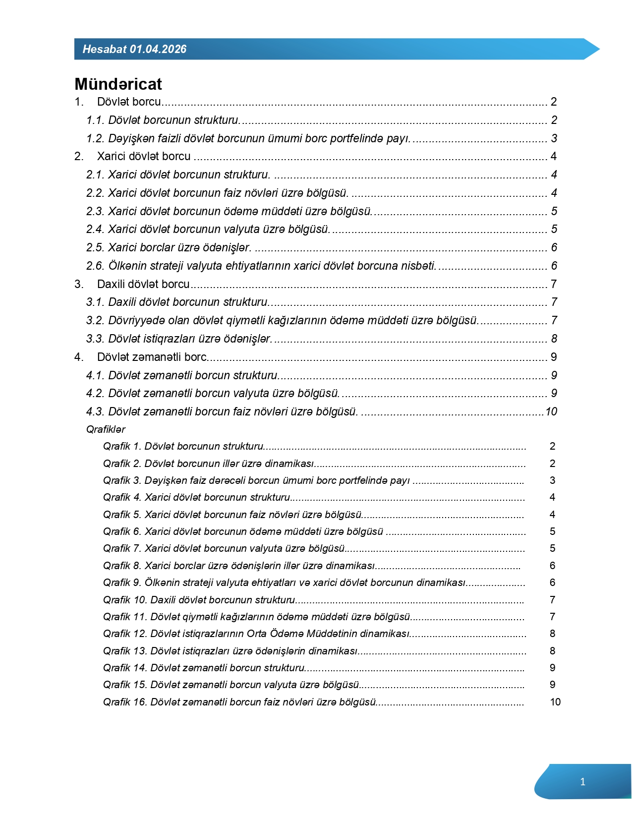 2026-cı ilin 01 aprel tarixinə daxili dövlət borcu 16 milyard 492,9 milyon manat və ya 2026-cı il üzrə proqnozlaşdırılan ÜDM-in 12,6 faizini təşkil etmişdir. Daxili dövlət borcu 2026-cı ilin 01 yanvar tarixi ilə müqayisədə 1 milyard 311,6 milyon manat azalmışdır. Hesabat tarixinə daxili dövlət borcunun 7 milyard 695,5 milyon manatı dövriyyədə olan dövlət qiymətli kağızlarının, 8 milyard 797,4 milyon manatı isə hökumətin üzərinə götürdüyü dövlət zəmanətli öhdəliklərinin payına düşür.