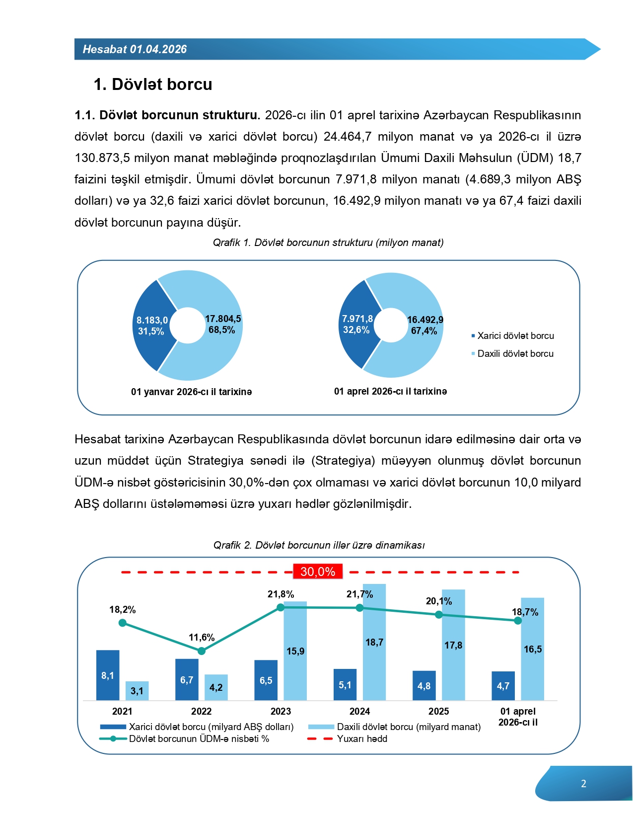2026-cı ilin 01 aprel tarixinə Azərbaycan Respublikasının dövlət borcu (daxili və xarici dövlət borcu) 24 milyard 464,7 milyon manat və ya 2026-cı il üzrə 130 milyard 873,5 milyon manat məbləğində proqnozlaşdırılan Ümumi Daxili Məhsulun (ÜDM) 18,7 faizini təşkil etmişdir.