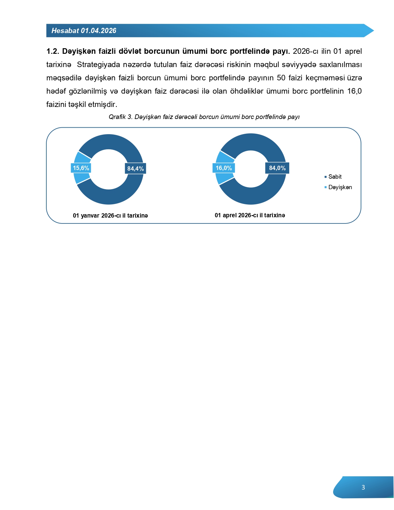 2026-cı ilin 01 aprel tarixinə Strategiyada nəzərdə tutulan faiz dərəcəsi riskinin məqbul səviyyədə saxlanılması məqsədilə dəyişkən faizli borcun ümumi borc portfelində payının 50 faizi keçməməsi üzrə hədəf gözlənilmiş və dəyişkən faiz dərəcəsi ilə olan öhdəliklər ümumi borc portfelinin 16 faizini təşkil etmişdir.