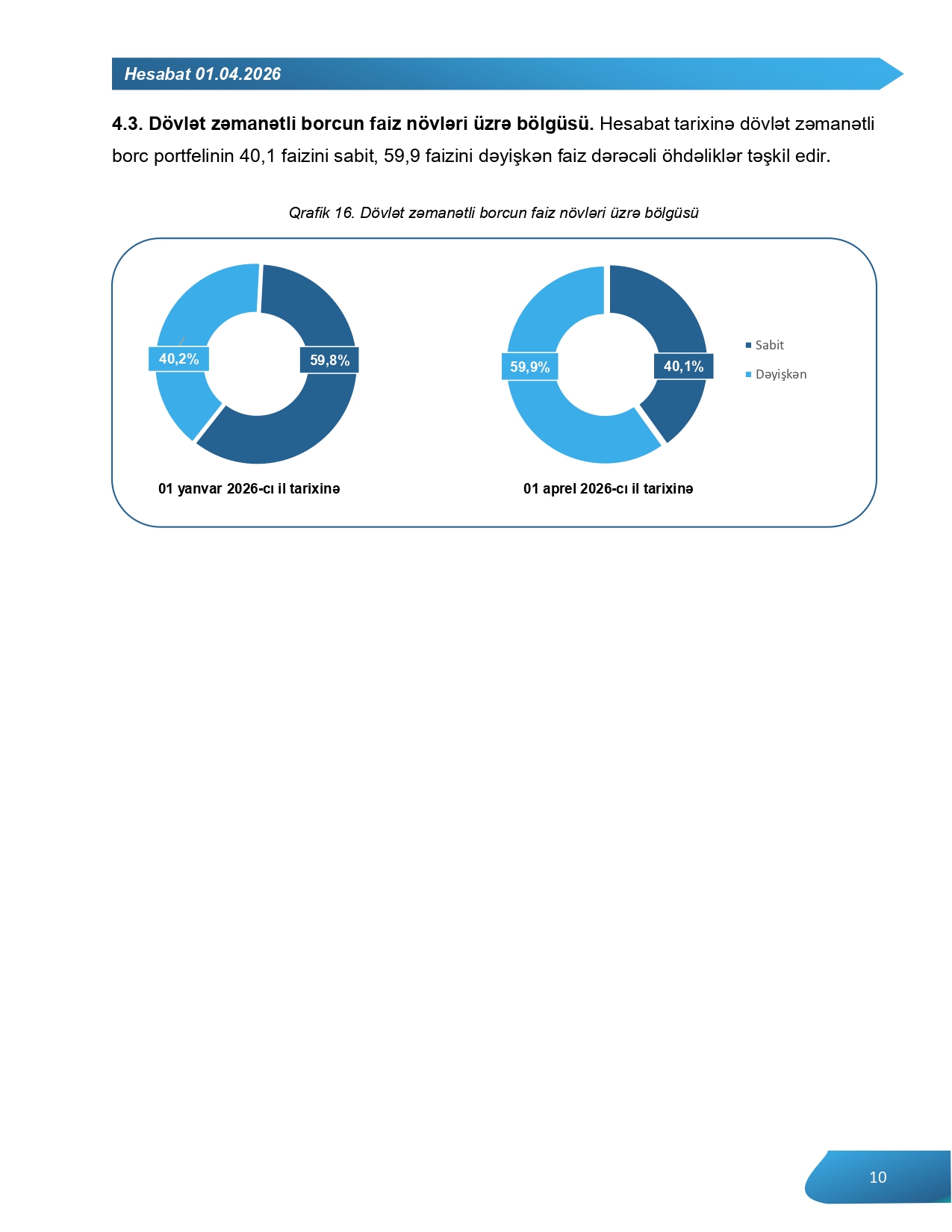 Hesabat tarixinə dövlət zəmanətli borc portfelinin 40,1 faizini sabit, 59,9 faizini dəyişkən faiz dərəcəli öhdəliklər təşkil edir.