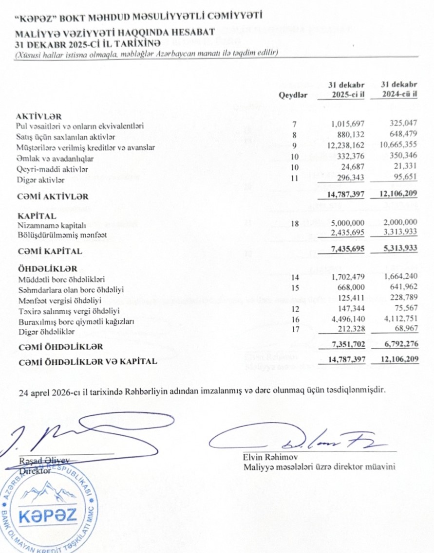 2025-ci ildə “Kəpəz” BOKT-ın kredit portfeli (müştərilərə verilmiş kreditlər) 1 milyon 573 min manat və ya 14,7% artaraq 31 dekabr 2025-ci il taroixində 12 milyon 238 min manata çatıb.